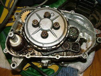 | 元々YSR50にはタコメーターがついていませんが、サビサビエンジンにはタコメーター用のギアがエンジン内に組み込まれていましたので、線を接続さえすれば使えました。但し、今回購入した中古エンジンにはこのギアが無いため、タコメーターはついているのですが動きません。(当たり前ですが・・・)そのうちサビサビエンジンから移植しようと思っているのですが、クランクケース用パッキンなどが手持にはなく、、オイル漏れするのも嫌なのでRBに注文を入れたいて、入荷した後になるでしょう。写真左上の白っぽいギアがタコメーター用のものです。 |