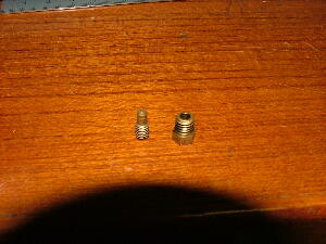 試走しましたが、エンジンはすんなりかかったものの、アイドリングがレッドゾーンまで行くような状況。(タコメーターは動作していませんが)見直すとスロットルストップとエアのスクリューが逆に装着されていた(笑)。気を取り直し取り付けなおした後エンジンをかけたがやはりアイドリングが安定しない。キャブからもオーバーフローしてくるし。赤男爵でジェット類ガスケット類注文し部品を交換します。画像は詰まりジェット。 |